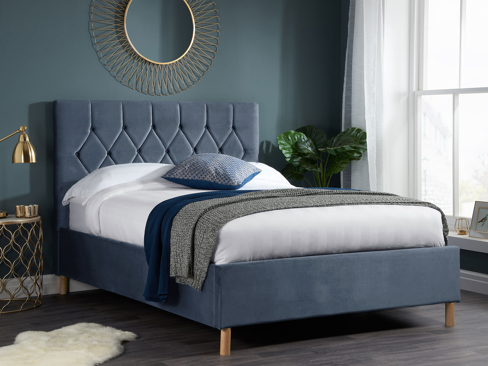 The Loxley bed frame is upholstered in polyester with complementary light feet and is available in mustard, grey, green and blue.